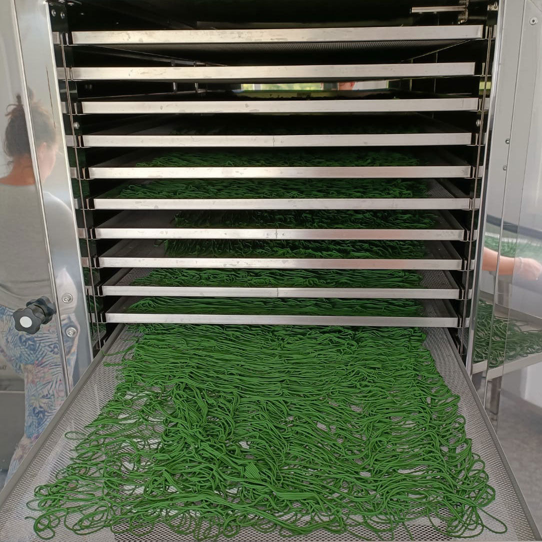 Elle est ensuite égouttée sous presse, puis nous la façonnons en spaghetti très fins pour un séchage à basse température afin de conserver ses précieuses vitamines et nutriments.